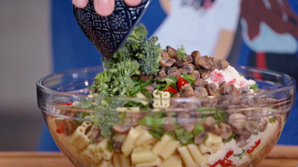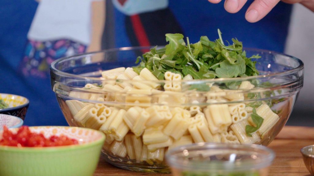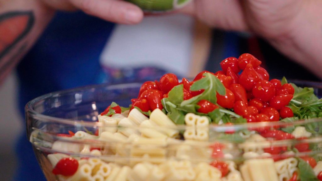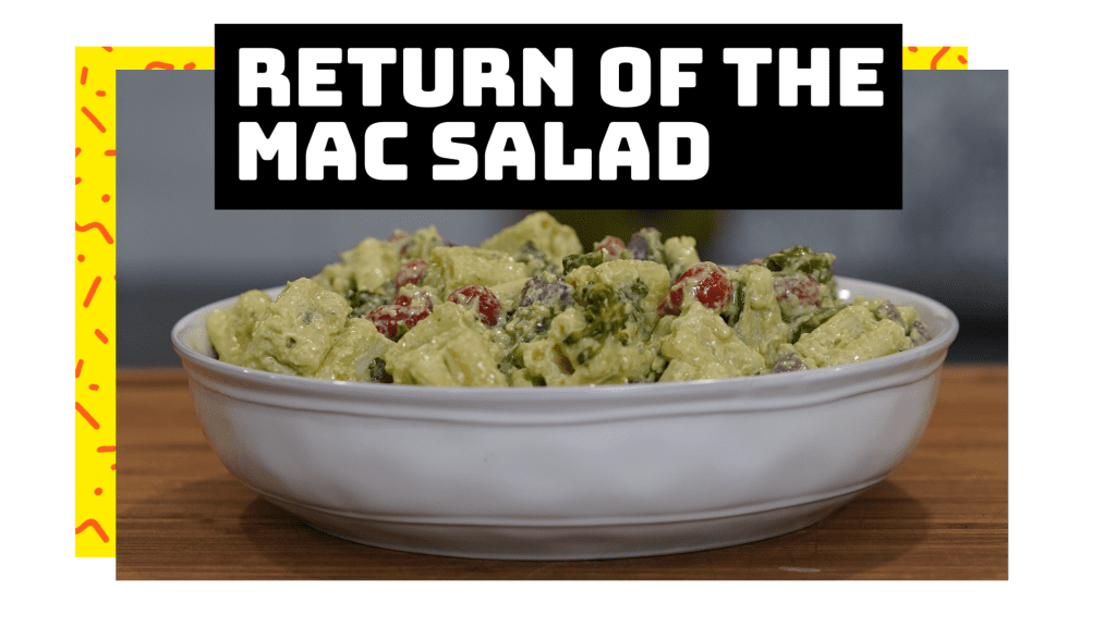 There’s something just plain dreamy about using something you either caught, grew or harvested yourself when you’re cooking, and this recipe is as dreamy as it gets, like that big ol’ beautiful moon on a starry night – it tends to steal the show from the other things you’re serving. This pesto mac salad uses a great homemade pesto we love, and we use garlic picked from our own garden. We blend in this garlicky dream with some mayo and a few other bright flavors to make a creamy, dreamy mac salad that can team up with anything you’re dreaming about for a perfect cookout or summer party. The key to a good mac salad is the right balance of flavors and textures. We want some creaminess from the mayo, a flavor shot from the pesto, and all the other cheeses and other tastes come together to make a salad your guests or family are gonna dream about for a long time!