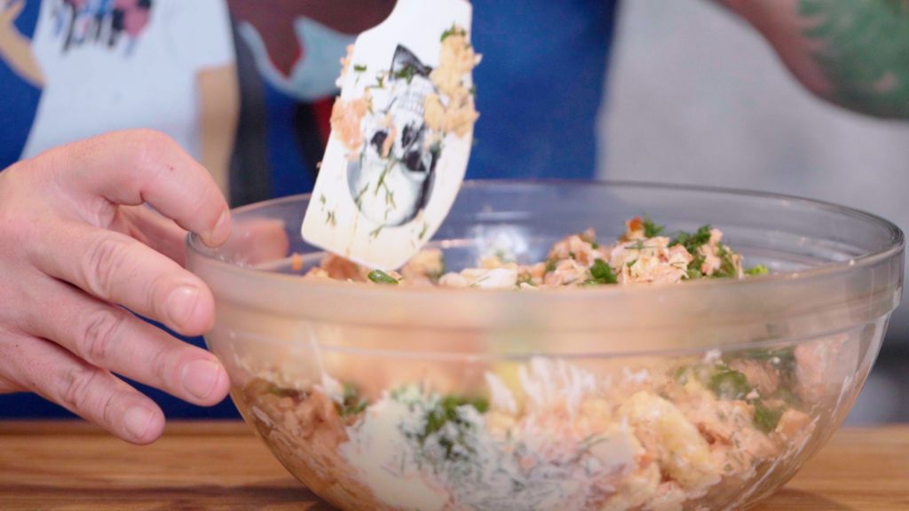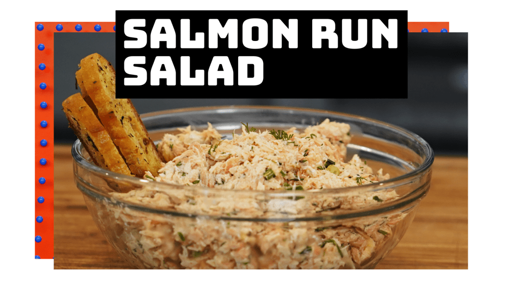 Is anything more refreshing than a bright spring or summer salad? How ’bout one that’s protein-based that you just crave, even the next day? Look no further than our summer favorite – the Salmon Run Salad. We believe protein is the key to salads, after all. The Spatchcock Funk squad loves salmon, especially ones we caught. We’ve devoured it at joints all the way from Alaska to Lake Ontario, and we love it as sushi, in a chowder, or grilled up too. But this salad might be our favorite iteration of this big flavor fish. It makes everything better on a warm summer day, for sure, but works to brighten up a winter happy hour, too. Served with crispy crostinis, this appetizer (or sandwich spread) is light, refreshing and has a cool flavor profile – the dill and lemon party so well with each other, you get the feeling they might go home together, too. The flavor combinations make the fresh salmon really stand out. If you’re having a few glasses of wine with some girlfriends or want something different for a great lunch or appetizer, get yourself some fresh salmon and get mixin’, because we’re mixing it up today.