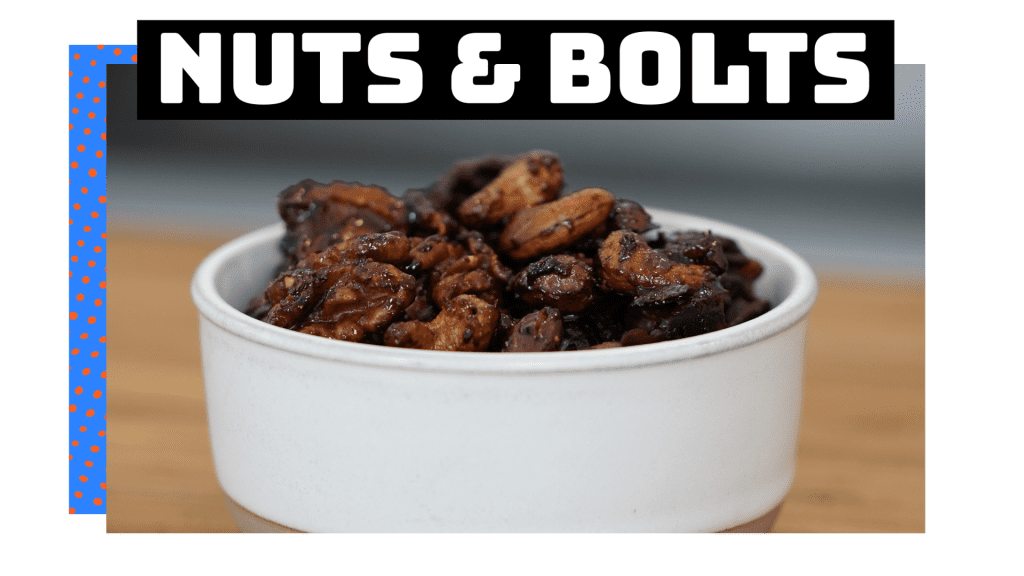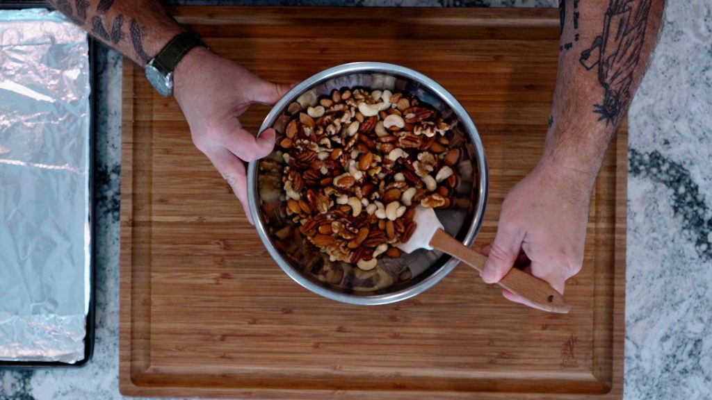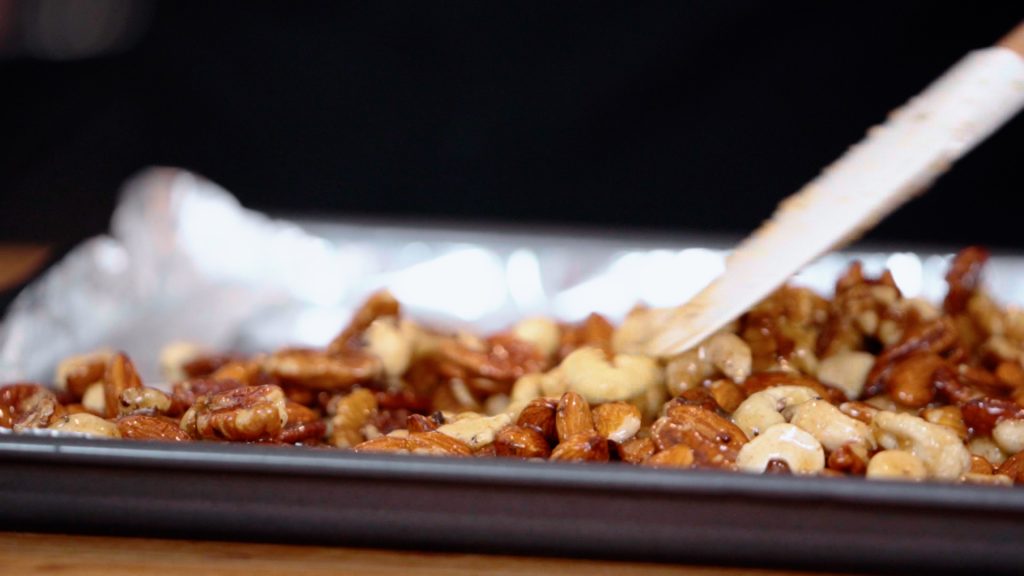 When we’re layin’ down some cards (or just drinking in general), we love to have something salty and sweet to snack on. This makes beer and booze taste that much better, and who doesn’t like a little snack? These sweet and salty nuts stay good for a week or so, and can double as snacks at work or to pack in a school lunch for a little treat. The key is to use raw nuts, coat ‘em and roast ‘em, and all of a sudden your house is going to smell fantastic. We don’t want them to be sticky, so this roasting process keeps them just how we want ‘em, tacky enough to hold, but not too sticky where they’ll get on your cards. They’re great to have on a bowl on the felt table because they won’t mess anything up if they’re spilled. Grab some cashews, pecans, almonds and walnuts (or any nuts you want), and let’s get roastin’. We’re nuts for these nuts.